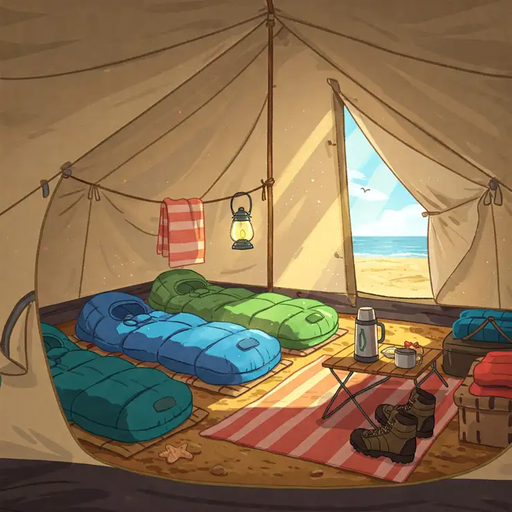 Illustration showcasing various colorful beach tents pitched along a sandy shoreline with the ocean in the background.